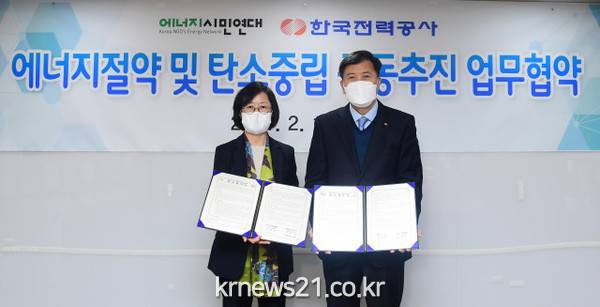 한국전력(대표이사 사장 김종갑)은 2월 19일 서울 중구 한전 경인 건설본부에서 국내 최대 규모의 에너지 전문 NGO 연대기구인 에너지시민연대(사무총장 홍혜란)와 ‘에너지절약 및 탄소중립 공동추진을 위한 업무협약’을 체결했다.