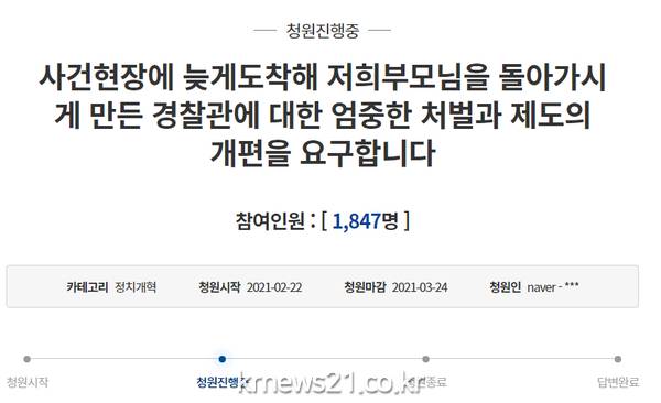 22일 청와대 국민청원 게시판에는 '사건현장에 늦게도착해 저희부모님을 돌아가시게 만든 경찰관에 대한 엄중한 처벌과 제도의 개편을 요구합니다'란 제목의 글이 올라왔다.