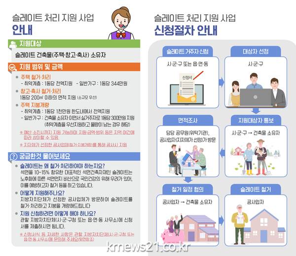 지붕철거 지원금은 가구당 최대 344만 원이다. 슬레이트 지붕이 설치된 주택이나 부속건축물 소유주 또는 세입자가 지붕 철거를 신청하면 시 위탁업체에서 철거해 폐기해 준다. 기초생활보장수급자·차상위계층과 한부모·독거노인 가구 등 취약계층은 비용 전액을 지원받을 수 있다.