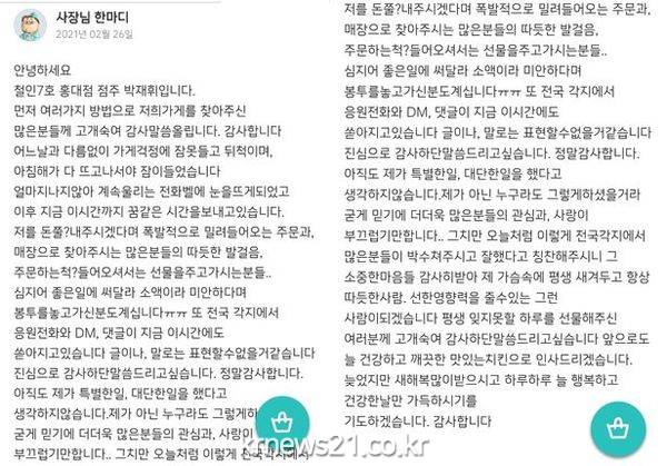 점주 박재휘씨는 “폭발적으로 밀려들어오는 주문과, 매장으로 찾아주시는 많은 분들의 따뜻한 발걸음… 심지어 좋은 일에 써 달라 소액이라 미안하다며 봉투를 놓고 가신 분도 계신다”며 “전국 각지에서 응원전화와 메시지, 댓글이 지금 이 시간에도 쏟아지고 있다”고 했다. 이어 “글이나 말로는 표현할 수 없을 것 같다”며 “진심으로 감사하다”고 했다.