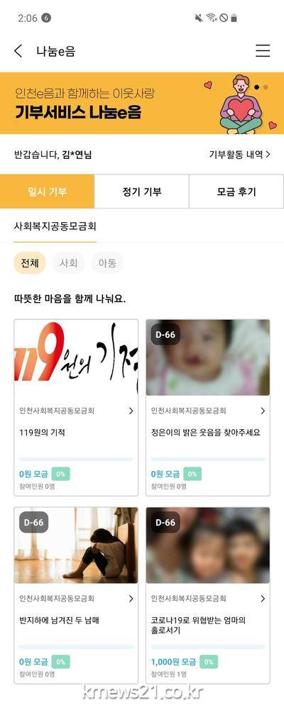 ▲ [이미지제공 = 인천시]인천광역시(시장 박남춘)는 코로나19 장기화로 인해 더 큰 고통을 겪고 있는 사회적 약자들을 위해 인천e음 기부플랫폼 ‘나눔e음’서비스를 2021년 3월 2일부터 개시한다고 밝혔다.