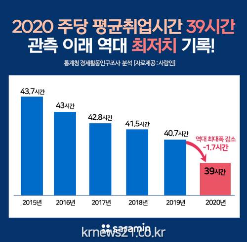 주당 평균 취업시간은 2019년 40.7시간보다 무려 1시간 42분(1.7시간)이 줄어들어, 관련 통계를 작성한 1980년 이래 가장 큰 폭으로 감소했다.