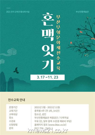 ‘2021년 전수교육관 활성화 사업’의 하나로 문화재청이 후원하는 이번 교육은 무형문화재의 전승·보존과 우리 전통문화 우수성을 시민들에게 알리기 위해 기획되었다.