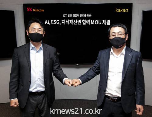 ▲ [사진제공 = SK텔레콤]SK텔레콤(대표이사 박정호)과 카카오(공동대표 여민수·조수용)가 AI, ESG(환경·사회·지배구조), 지식재산권 분야에서 상호 협력하고 해당 분야 기술 등 주요 자산을 우리 사회와 나누는 데 뜻을 같이했다.