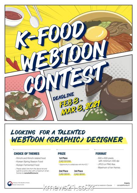 주캐나다한국문화원은 한식을 주제로 하는 한식 웹툰 공모전(2. 8.~3. 8.)과 함께 알곤퀸 대학 요리학과 학생을 대상으로 김치와 한식을 주제로 온라인수업을 진행(2. 17.)했다. 5월에는 캐나다 오타와에 있는 르꼬르동블루 요리학교 학생을 대상으로 온라인 한식강좌를 진행할 예정이다.