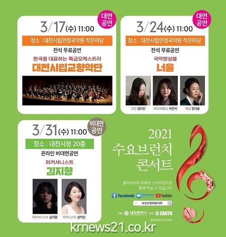 대전시에 따르면, 올해 수요브런치 콘서트는 오는 3월 17일과 24일 수요일 오전 11시에 대전시립연정국악원 작은마당에서 전석 무료 대면공연으로 개최하며, 사회적 거리두기 단계에 따라 좌석 띄우기 등 공연장 운영 수칙에 따라 운영된다.