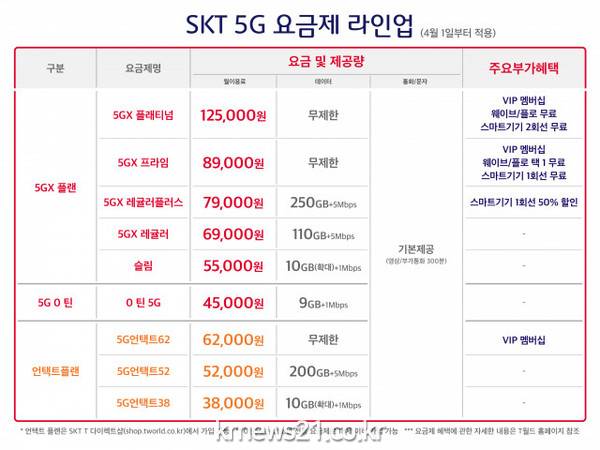SKT는 4월 1일부터 슬림(월 5만5000원) 요금제와 5G 언택트38(월 3만8000원)의 기본 데이터 제공량도 기존 9GB에서 10GB로 확대해 저가 요금 사용 고객의 혜택도 강화할 계획이다.