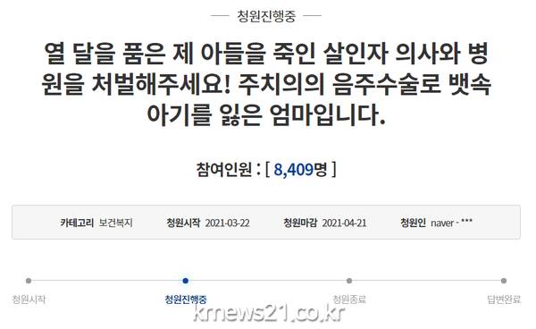 이같은 사실은 전날 청와대 국민청원에 ‘열 달 품은 제 아들을 죽인 살인자 의사와 병원을 처벌해주세요’라는 글이 올라오면서 알려졌다.
