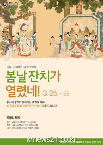 ▲ [사진=홍보포스터]문화재청 국립고궁박물관(관장 김동영)은 큐레이터(학예연구사)가 추천하는 왕실 유물에 대한 온라인 행사 ‘봄날 잔치가 열렸네!’를 오는 26일부터 28일까지 사회관계망서비스(국립고궁박물관 인스타그램) 구독자를 대상으로 진행한다.