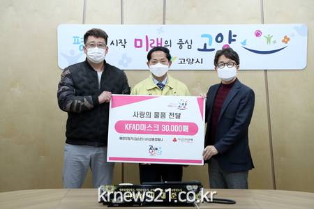 ▲ [사진제공 = 고양시]고양시(시장 이재준)는 지난 22일 해양모험가 김승진 회장과 (주)삼흥컴퍼니가 코로나19 극복 희망 나눔을 위해 KF-AD 마스크 3만매를 기부했다했다고 밝혔다.