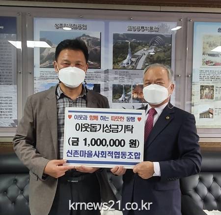 ▲ [사진제공 = 고성군]하이면 신촌마을 사회적협동조합(이사장 김재명)은 3월 24일 오전 하이면사무소를 방문해 이웃돕기성금 100만 원을 기탁했다.