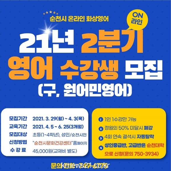 순천시(시장 허석)는 시민외국어 역량 강화를 위해 추진하고 있는 시민외국어센터의 2021년 제2기 영어회화반 온라인 수강생을 3월 29일(월)부터 4월 2일(금)까지 5일간 모집한다.