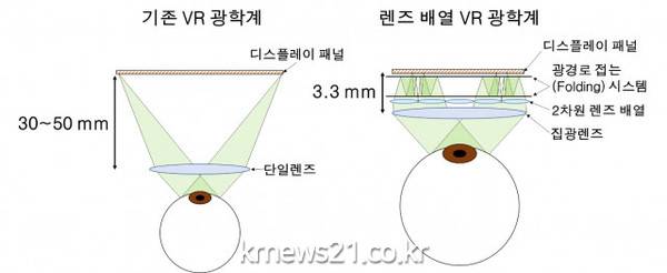기존 VR 디스플레이의 부피가 큰 이유는 내부에 존재하는 공간 때문이다. 이 공간의 두께를 줄이려면 VR 광학계 렌즈의 초점거리를 줄여야 하지만 눈과 렌즈 사이에 확보돼야 할 최소 거리(아이 릴리프, Eye Relief)를 위해서는 너무 짧은 초점거리의 렌즈는 사용할 수 없는 한계가 있다. 연구팀은 이러한 한계를 극복할 수 있는 새로운 VR 광학계 설계에 착수했다.