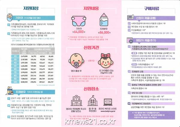 지원 대상은 만 2세 이하(0~24개월)의 영아를 키우는 기초생활보장수급자, 차상위계층, 한부모가족, 기준중위소득 80% 이하의 장애인 가구와 둘째아 이상의 다자녀 가구다.