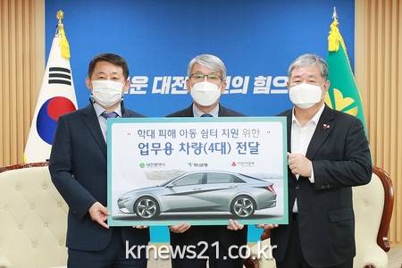 ▲ [사진제공 = 대전광역시]대전시(시장 허태정)는 지난 26일, 하나은행에서 학대피해아동 보호 업무 지원을 위한 차량 4대(1억원 상당)를 기탁했다고 밝혔다.