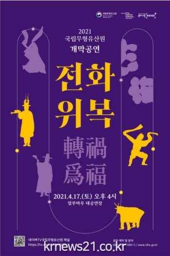 ▲ [사진=홍보포스터]문화재청 국립무형유산원(원장 이종희)은 오는 17일 오후 4시부터 국립무형유산원 얼쑤마루 대공연장(전북 전주시)에서 2021 국립무형유산원 개막공연 「전화위복_轉禍爲福」을 진행한다.