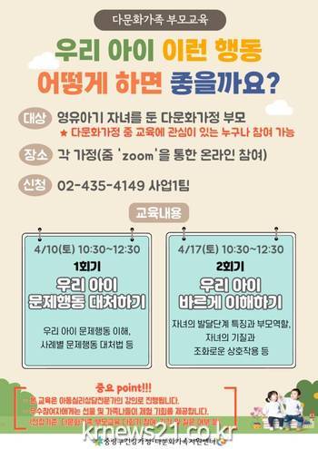 ‘생애주기별 부모교육’은 지역 내 다문화가족 개인 및 부부, 부모와 자녀를 대상으로 실시하며, 4월부터 11월까지 월별로 각각 다른 주제로 운영된다. 첫 교육은 오는 4월 10일 아동심리상담전문가가 ‘우리아이 문제행동 대처하기’를 주제로 강의하며 우리 아이 문제행동 이해, 사례별 문제행동 대처법 등에 대해 알아본다.