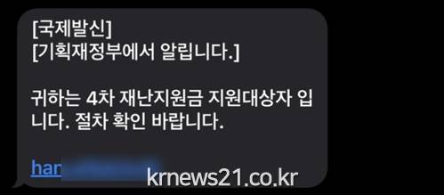 공격자는 기획재정부로 사칭해 ‘귀하는 4차 재난지원금 지원 대상자입니다. 절차 확인 바랍니다’라는 내용과 함께 특정 URL이 포함된 문자메시지를 유포했다.