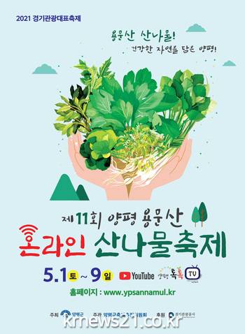 ▲ [사진=홍보포스터]정동균 양평군수는 2021년 제11회 양평용문산 산나물 축제를 온라인 기반으로 개최하기로 결정하였다. 10회 걸쳐 지속된 축제를 이어가기 위해 현실적인 대안을 고심한 끝에 위드(With) 코로나 시대 맞춤형 축제를 기획하였고, 경기도 10대 대표축제 공모사업에서 대표 축제로 당당히 선정되어 도비 8천만원도 추가 확보하였다.