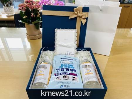 키트 구성품은 손세정제 2개, 마스크 20매로, 완치 이후에도 감염 예방을 위한 노력을 통해 감염병 확산 차단에 동참해달라는 의미를 담았다.