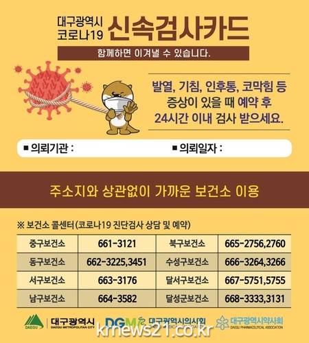 ▲ [이미지제공 = 대구시]대구시는 4월 19일부터 의료기관, 약국을 방문한 코로나19 유증상자가 신속하게 진단검사를 받을 수 있도록 ‘코로나19 신속검사 카드’ 사용을 시행한다.