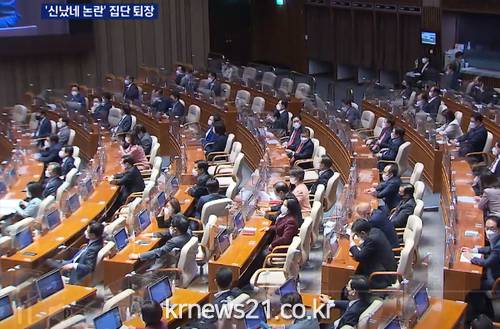 ▲ [사진출처 = MBN뉴스 캡처]국민의힘 의원들이 20일 "신났네 신났어" 논란을 빚은 김상희 부의장에게 사과를 요구하며 본회의장에서 집단 퇴장했다.