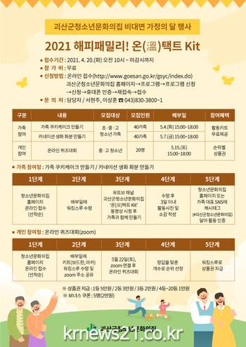 ▲ [사진=홍보포스터]충북 괴산군은 괴산군청소년문화의집 가정의 달 행사로 ‘해피패밀리! 온(溫)택트 Kit’ 프로그램을 운영한다고 21일 밝혔다.