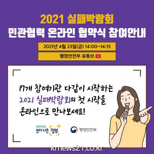 한편 행정안전부는 5월 말, ‘2021 실패박람회’ 선포식을 개최하고, 누구나 언제 어디서든 자유롭게 실패박람회에 참여할 수 있도록 온라인과 오프라인으로 개최되는 다양한 프로그램을 안내할 계획이다.