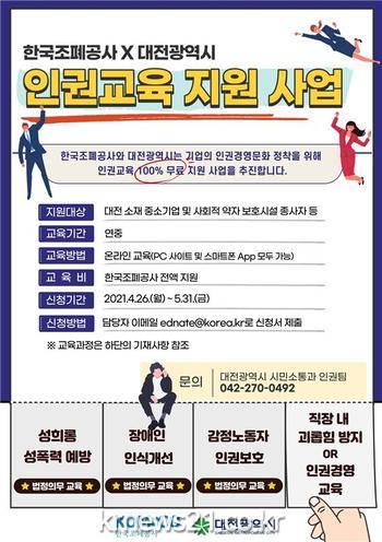 ▲ [사진=홍보포스터]대전시는 지역 내 사회적 갈등을 예방하고 건강한 인권문화를 확산시키기 위해 5월부터 ‘인권 경영 교육’지원에 나선다.