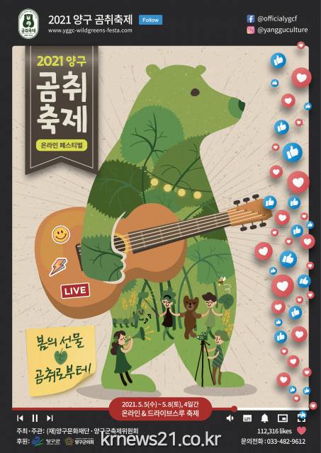 2021 양구 곰취축제 온라인 페스티벌에 대한 자세한 내용은 양구문화재단 공식 페이스북과 인스타그램, 공식 홈페이지를 참고하면 된다.