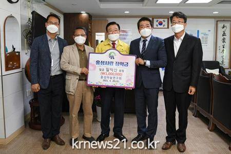 ▲ [사진제공 = 홍성군]홍성마늘연구회는 지난 28일 (재)홍성사랑장학회에 장학금 100만 원을 기탁했다.