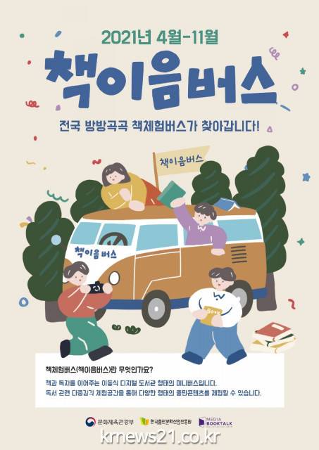 ▲ [사진=홍보포스터]문화체육관광부(장관 황희)와 한국출판문화산업진흥원(원장 김수영, 이하 출판진흥원)은 ‘책 읽는 사회문화 기반 조성’ 사업의 하나로 ‘2021 책체험버스(책이음버스)’를 4월부터 운영하고 있다.