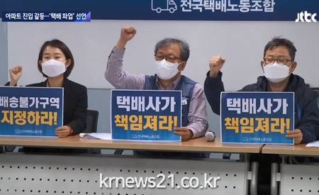 ▲ [사진출처 = JTBC 캡처]지난달 서울 강동구의 한 대단지 아파트에서 택배 차량의 지상 진입을 금지하면서 빚어진 갈등이 결국 택배노조의 부분파업으로 이어졌다.