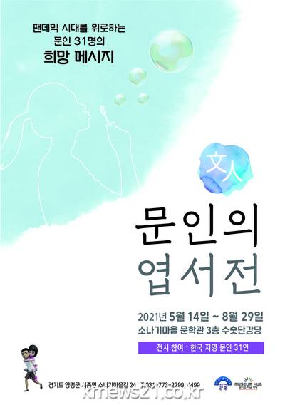 ▲ [사진=홍보포스터]황순원문학촌 소나기마을은 5월 14일부터 8월 29일까지 문학관 3층 수숫단 강당에서 기획전시 <문인의 엽서展>을 개최한다. 이번 전시는 팬데믹 시대를 위로하는 저명 문인들의 자작시, 금언, 좌우명 등을 참여 문인의 육필로 전시한다. 또한 전시 벽면은 3D일러스트로 표현되어, 문인들의 글귀를 그래피티 미술의 느낌으로 감상할 수 있다. 참여작가로는 조정래, 김홍신, 이순원 소설가 등과 신달자, 정호승, 도종환 시인 등이며, 한국의 저명 문인 31인이 참여한다. 또한 관람객들이 스스로 메시지를 써서 지인에게 전할 수 있는 전시기념 엽서도 무료 배포한다.