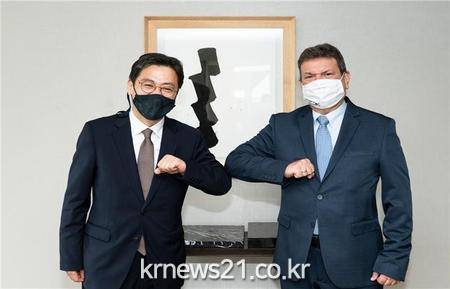 ▲ [사진제공 = 부산시]부산시(시장 박형준)가 12일 오후 2시 한국-이스라엘 산업기술 협력 조약 개정 및 FTA 서명식 참석을 위해 방한한 아디브 바루크 이스라엘 수출공사 회장과 간담회를 갖고, 부산지역 기업들과 이스라엘 기업들과의 기술협력 및 경제교류 방안에 대해 논의했다.
