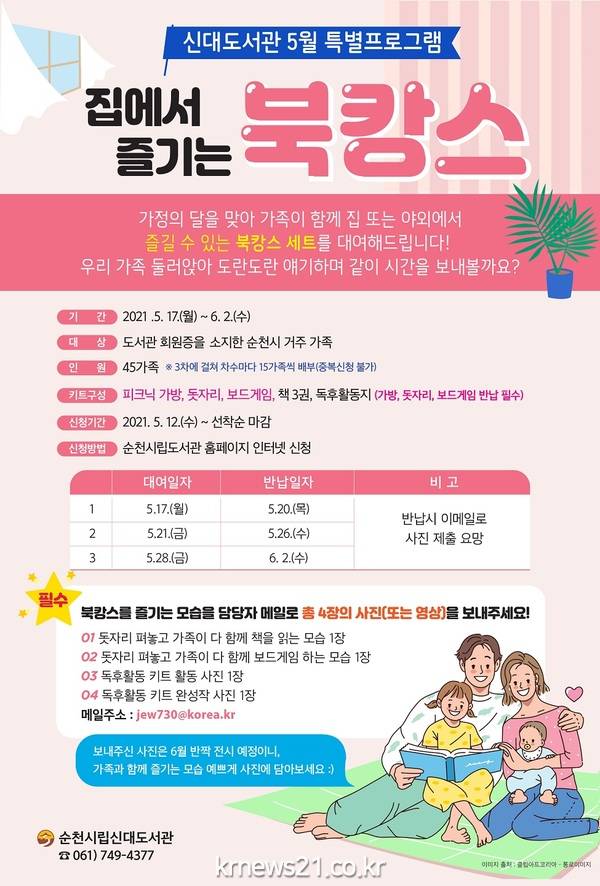 순천시(시장 허석)는 가정의 달을 맞아 오는 17일부터 ‘집에서 즐기는 북캉스’ 프로그램을 운영한다.