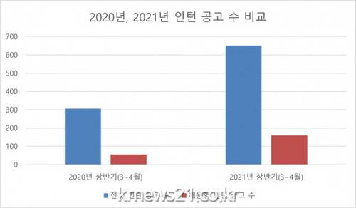 실제로 취업포털 캐치에 올라온 2020년 상반기 인턴 공고와 2021년 상반기 인턴 공고를 비교해보니 지난해 상반기에 올라온 인턴 공고가 306개였다면, 올해 같은 기간 올라온 인턴 공고는 651개로 두 배 이상 늘어난 것을 확인할 수 있었다. 특히 채용형 인턴을 뽑는 공고 수는 작년 56개에서 올해 160개 정도로 늘어나 대폭 증가했다. 이는 지난해 초반에 코로나19 사태로 채용 자체가 감소했던 것을 감안하더라도 큰 수치로 증가한 것이다.