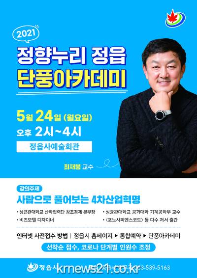 정읍시는 오는 24일 오후 2시 정읍사예술회관 공연장에서 ‘사람으로 풀어보는 4차산업혁명’을 주제로 제94회 정향누리 정읍 단풍아카데미를 개최한다.