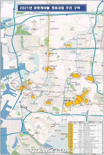 대상지역은 중구 율목동 일원, 동구 송림시장 일원, 남동구 인수초·새말초 일원, 계양구 효성마을 도시재생지역 등 재래시장·초등학교 주변 위주로 총 18개 구역이 공중케이블 정비협의회의 평가와 심의를 통해 최종 확정됐으며, 높은 평가 점수를 받아 당초 정부에서 정한 통신 분야 기준금액 125억 원 보다 많은 159억을 확보했다.