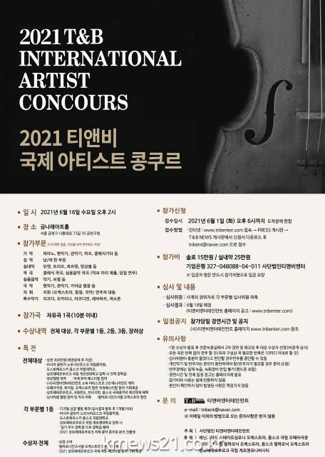 ▲ [사진=홍보포스터]클래식과 다양한 장르의 컬래버레이션으로 명품 클래식의 저변 확대에 앞장서는 티앤비엔터테인먼트가 국내의 클래식 신예아티스트들의 국제무대 진출을 위해 ‘2021 티앤비 국제 아티스트 콩쿠르’를 2021년 6월 16일(수) 금나래아트홀에서 개최한다.