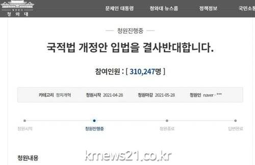 ▲ [이미지출처 = 국민청원 게시판 캡처]정부가 추진하는 국적법 개정에 대한 반대 여론이 거세다. 청와대 국민청원 게시판에 올라온 국적법 개정 철회 글에는 국민들의 동의가 31만을 넘어섰다.
