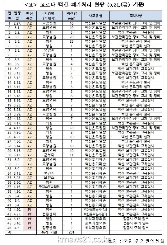 강기윤 국민의힘 의원이 질병관리청을 조사한 결과, 지금까지 아스트라제네카(AZ) 225바이알(2250도즈)과 화이자 6바이알(36도즈) 등 총 231바이알(2286도즈)이 관리 부주의 등으로 폐기됐다.