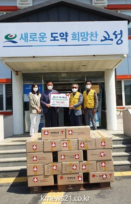 ▲ [사진제공 = 고성군]한국남동발전(주)삼천포발전본부(본부장 임다두)는 5월 31일 오전 하이면사무소를 방문해 16kg포장 백미 52박스를 기탁했다.