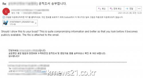 이번에 발견한 악성 메일은 총 3종류다. △공격자는 특정 사용자가 표창 발급을 위해 발송한 공적 조서 메일에 대한 회신으로 ‘당신의 상사에게 이 메일을 보여줄까?’라며 ‘정보가 공개되기 전에 첨부파일을 확인하라’는 협박성 내용을 기재했다 △다른 사용자가 보낸 동영상 편집본 확인 요청 메일에 ‘모든 데이터를 직접 확인하면 좋겠다, 파일을 첨부했다’는 내용으로 회신하기도 했다 △이외에 공격자는 특정 단체가 발송한 학술행사 안내 메일에 대한 회신으로 ‘일주일 전에 확인하라고 요청한 내용이 있다. 파일을 복사했으니 확인하라’는 내용을 보내 악성 첨부파일 실행을 유도하기도 했다.