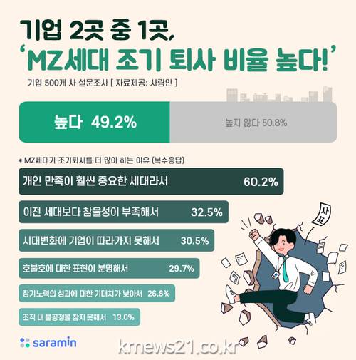 ▲ [자료제공 = 사람인]조기퇴사자는 모든 기업의 고민이다. 시간과 비용을 들여 어렵게 뽑은 인재가 퇴사하게 되면, 안정적인 조직운영이나 기업성장 측면에서도 악영향이 크기 때문이다. 특히 최근 MZ세대는 직무 적성이 안 맞거나 성장과 비전이 보이지 않으면, 과감하게 퇴사하는 경향이 크기 때문에 이들을 유지하기 위한 기업들의 고민이 깊다.