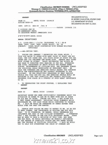 ▲ [이미지출처 = 5.18민주화운동기록관]5·18민주화운동기록관은 1980년대 미국 기록문서를 2일 홈페이지에 공개했다.