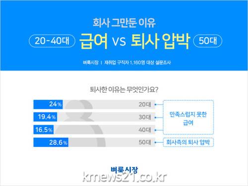 회사를 그만둔 이유는 세대별로 다소 차이를 보였다. 20대부터 40대까지는 ‘만족스럽지 못한 급여’를 1순위로 꼽은 반면, 50대의 경우 ‘회사측의 퇴사 압박’을 받았다는 답변이 28.6%로 가장 많았다.