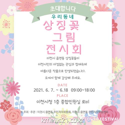 ▲ [사진=홍보포스터]이천시 읍면동주민자치학습센터(이천시 주민자치협의회)는 올해 읍면동 공유학습으로 우리동네 상징 꽃 그리기 우리의 학습은 빛이난다 프로젝트를 공동 운영하여 6월 7일부터 18일까지 이천시청 1층 종합민원실 로비에서 우리동네 상징 꽃 그림 전시회를 개최한다.