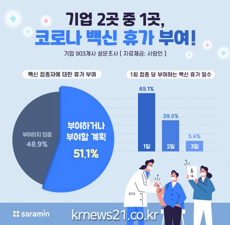 구인구직 매칭플랫폼 사람인(www.saramin.co.kr, 대표 김용환)이 기업 903개사를 대상으로 ‘백신 휴가 부여 현황’을 조사한 결과, 51.1%가 ‘백신 휴가를 부여하거나 부여할 계획’이라고 밝혔다.
