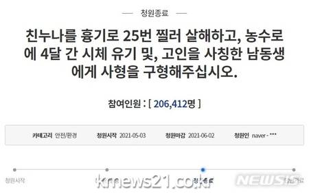 ▲ [이미지출처 = 청와대 국민청원 캡처]친누나를 살해한 뒤 시신을 인천 강화군 석모도 한 농수로에 유기한 20대 남동생의 재판이 다음주로 다가온 가운데 그를 엄벌해달라는 청와대 국민청원 게시글에 20만명이 넘는 누리꾼이 동의했다.